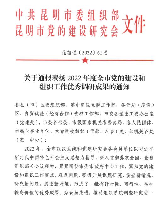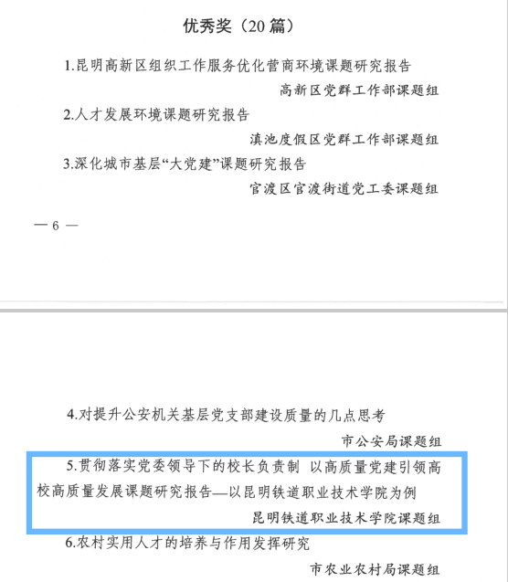 近日,据中共昆明市委组织部、昆明市党的建设研究处下发的《关于通报表扬2022年度全市党的建设和组织工作优秀调研成果的通知》,由我??翁庾橥瓿傻摹豆岢孤涫档澄斓枷碌男3じ涸鹬?以高质量党建引领高校高质量发展课题研究报告——以昆明铁道职业技术学院为例》荣获2022年度全市党的建设和组织工作优秀调研成果优秀奖。