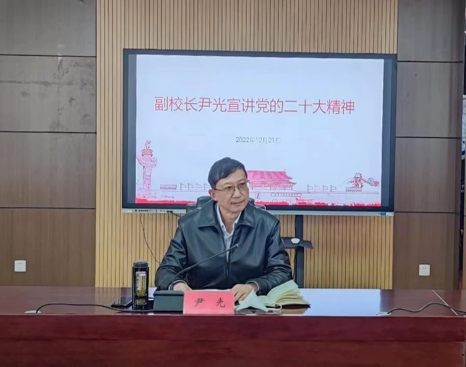 尹光以《深入学习党的二十大精神 推进学院高质量发展》为题,理论联系实际,重点围绕关于党的二十大的重大意义、党的二十大的主题、党的二十大的主要成果、大会的核心内涵、把学习成果转化为推进学院高质量发展五方面进行宣讲和解读。