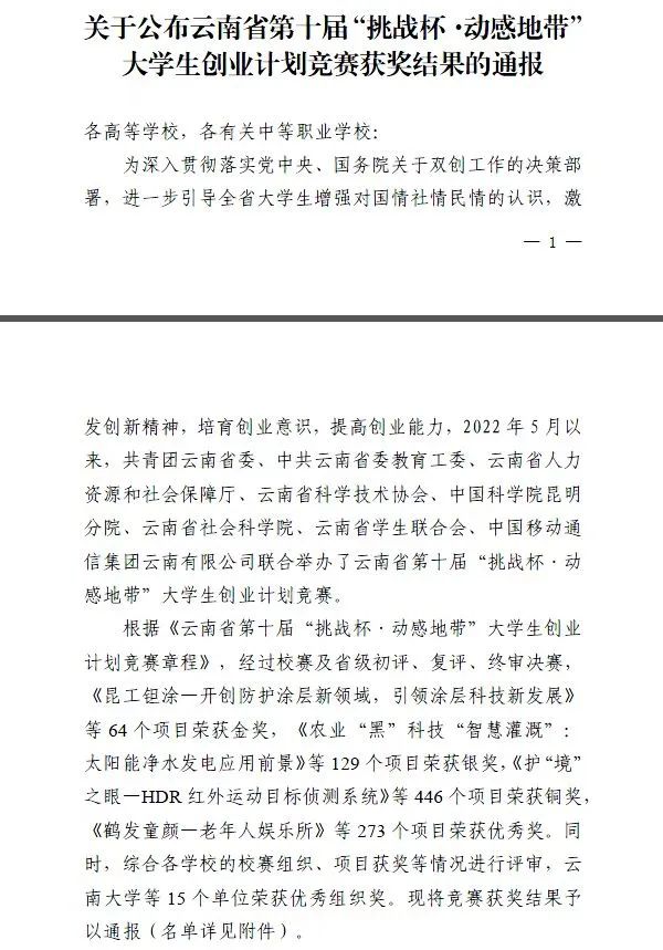 10月28日,云南省第十届“挑战杯·动感地带”大学生创业计划竞赛颁奖仪式在云南财经大学举行。本届竞赛全省76所学校共7194个项目参加比赛,经初赛评审,共有912个项目入围省级终审决赛,最终评出金奖64个、银奖129个、铜奖446个、优秀奖273个。根据《关于公布云南省第十届“挑战杯·动感地带”大学生创业计划竞赛获奖结果的通报》,我院学子分别荣获金奖1项,银奖4项,铜奖8项,优秀奖1项。