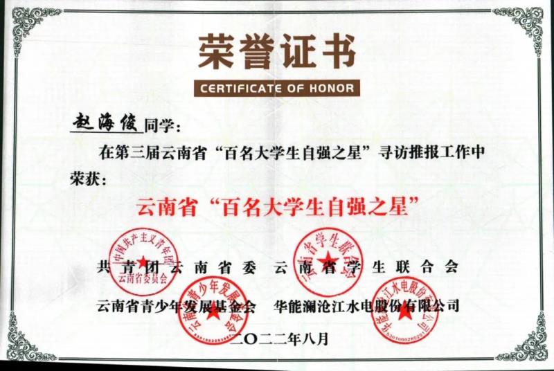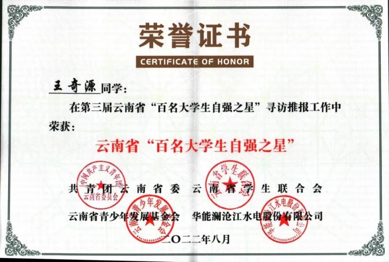 近日,由共青团云南省委、云南省学生联合会、云南青少年发展基金会、华能澜沧江水电股份有限公司联合举办的第三届云南省“百名大学生自强之星”评选结果已揭晓,我院机车车辆学院王奇源、电气工程学院赵海俊两名同学均荣获第三届云南省“百名大学生自强之星”荣誉称号。