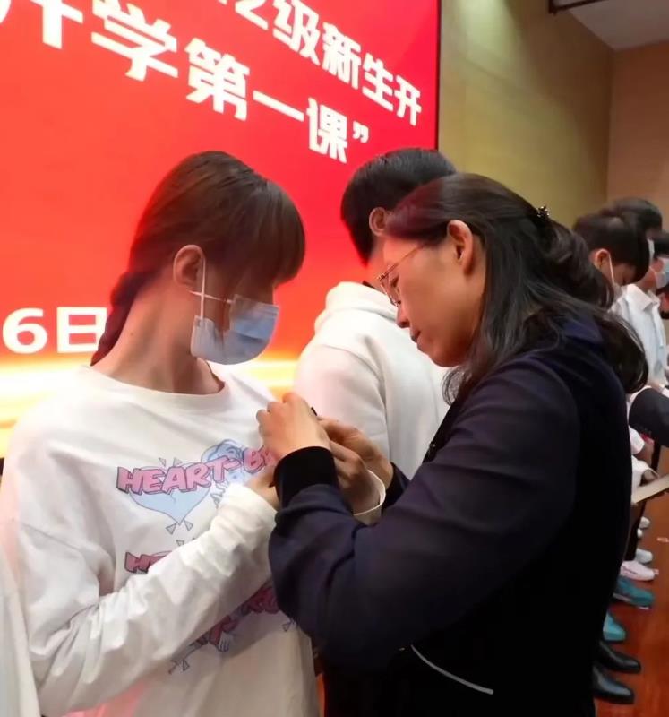 学院领导班子成员为新生代表佩戴?;詹⒃褪榧?。在校歌歌声中,开学典礼圆满落下帷幕。