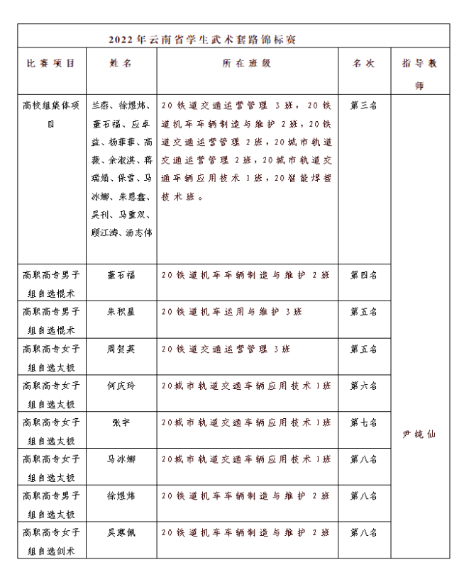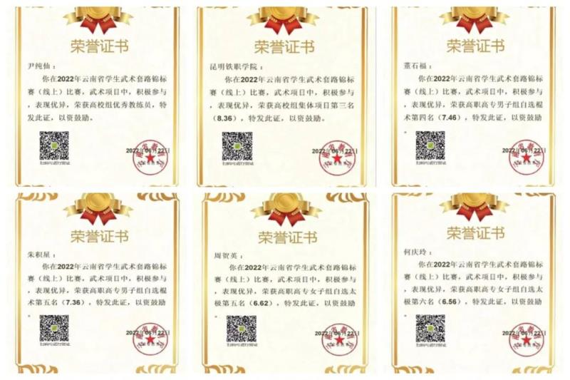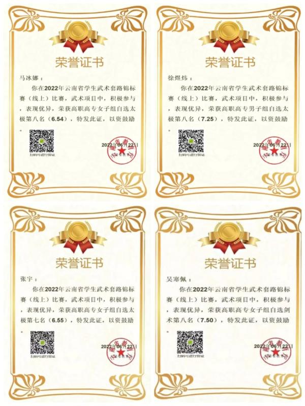 2022年云南省学生武术套路锦标赛(线上)在云南师范大学成功举办。在我院尹纯仙老师的指导下,经过赛前集练,选拔24名学子代表学院参赛,取得可喜成绩,尹纯仙老师荣获“优秀教练员”。