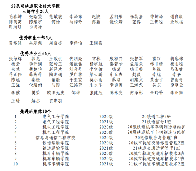 根据《中国云南省委教育工委 云南省教育厅关于公布2021-2022学年高校省级三好学生、优秀学生干部、先进班集体及大中专优秀毕业生名单的通知》,我院20名学生荣获省级三好学生;5名学生荣获优秀学生干部;66名学生荣获大专优秀毕业生;5名学生荣获中专优秀毕业生;10个班级荣获先进班集体。