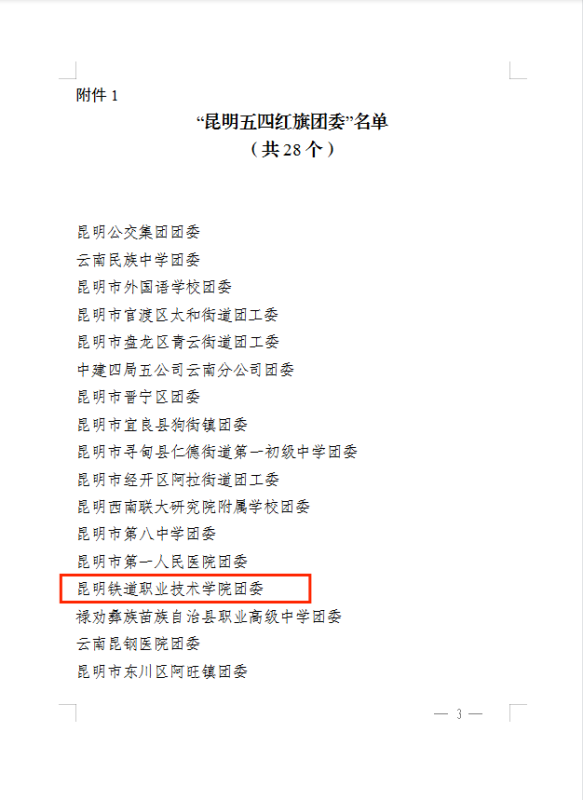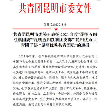 近日,共青团昆明市委下发了《共青团昆明市委关于表扬2021年度“昆明五四红旗团委”“昆明五四红旗团支部”“昆明优秀共青团干部”“昆明优秀共青团员”的通报》,全国铁道团委印发的关于表彰第二十一届“铁路青年五四奖章”等荣誉的决定,学院团委荣获“昆明五四红旗团委”和“全国铁路五四红旗团委”荣誉称号,20铁道交通运营管理1班何怡同学荣获“全国铁路优秀共青团员”荣誉称号。