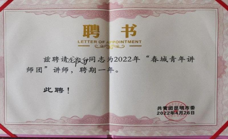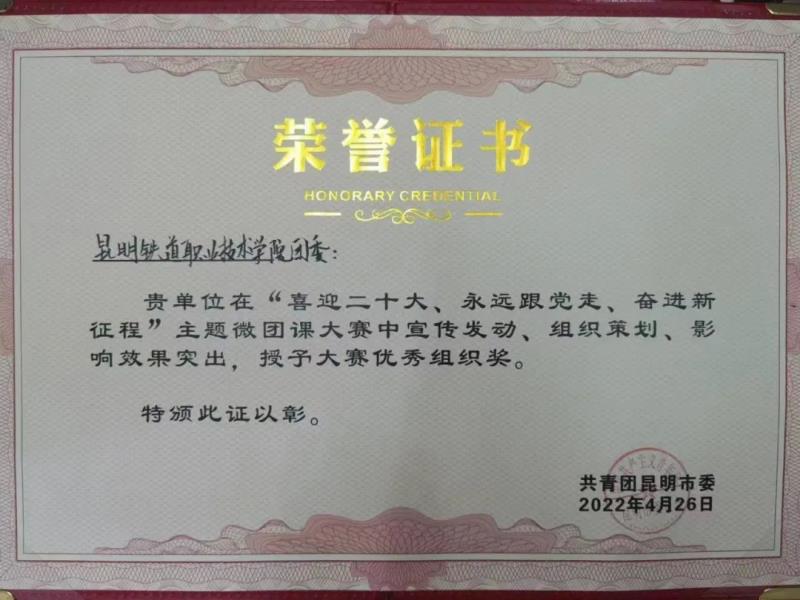 近日,共青团昆明市委组织开展了“喜迎二十大、永远跟党走、奋进新征程”主题微团课大赛。院团委、马克思主义学院共同组织开展了校级比赛,在 16件作品中推选出了3件作品代表学院参加市级复赛,最终电气工程学院代表队龙俊伊、朱佳琪、蒙宗坤同学作品《学习新思想,争做新青年》进入决赛并荣获三等奖。学院荣获“优秀组织奖”,龙俊伊同学被团市委聘为“春城青年讲师团”成员。