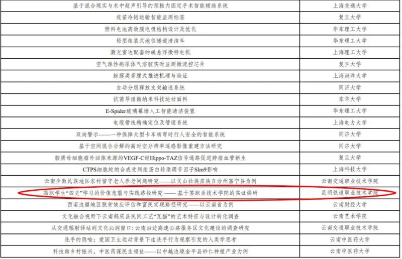 2021年第十七届“挑战杯”全国大学生课外学术科技作品竞赛于2022年3月26日—28日完成终审决赛。我院信息与通信工程学院晏丽明、李文燕、余朴莲三位老师指导樊晋滢、徐世松、宋俊民、王永远、王娟娟、姚欣辰六位同学完成的《高职学生“四史”学习的价值意蕴与实践路径研究—基于某职业技术学院的实证调研》项目荣获全国三等奖。
