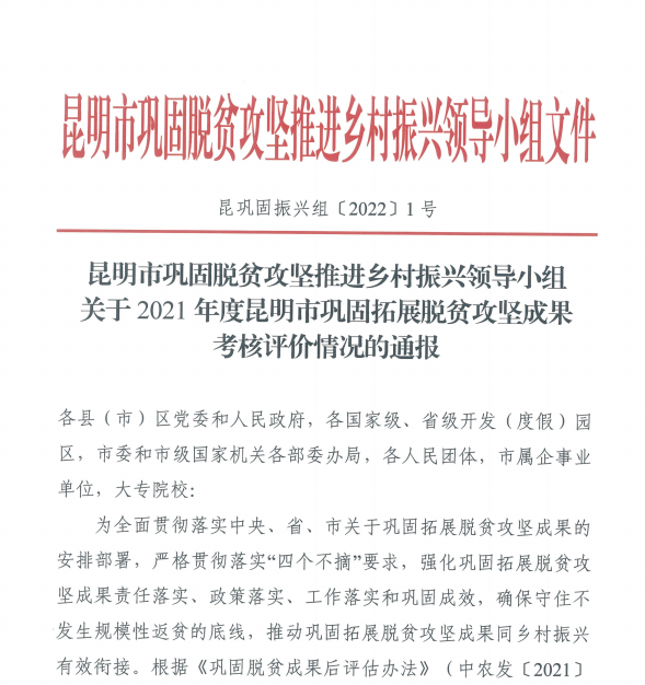 根据《昆明市巩固脱贫攻坚推进乡村振兴领导小组关于2021年度昆明市巩固拓展脱贫攻坚成果考核评价情况的通报》,在2021年度昆明市巩固拓展脱贫攻坚成果考核评价中,我院考核结果为“好”。