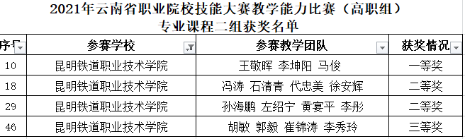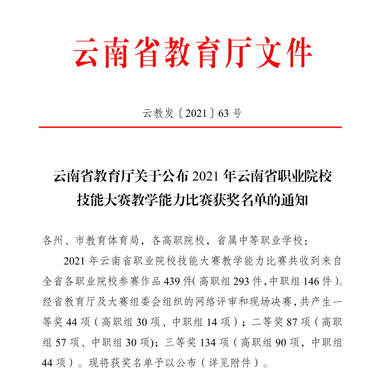 近日, 云南省教育厅发布《云南省教育厅关于公布2021年云南省职业院校技能大赛教学能力比赛获奖名单的通知》,我校4支参赛教学团队分别荣获一等奖1个,二等奖2个,三等奖1个的佳绩。