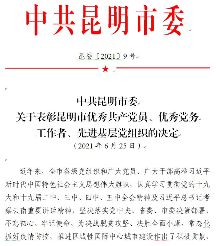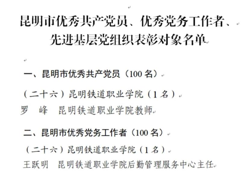 【喜讯】我校罗峰、王跃明同志分别荣获“昆明市优秀共产党员” “昆明市优秀党务工作者”荣誉称号
