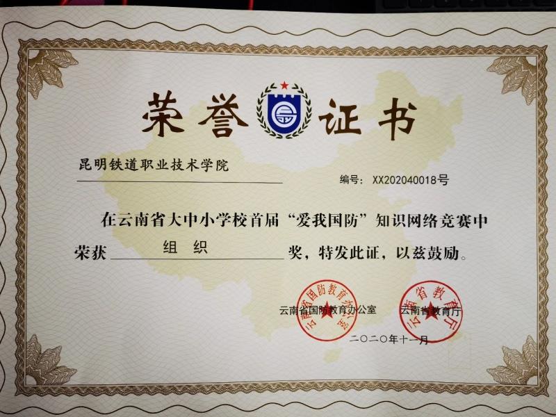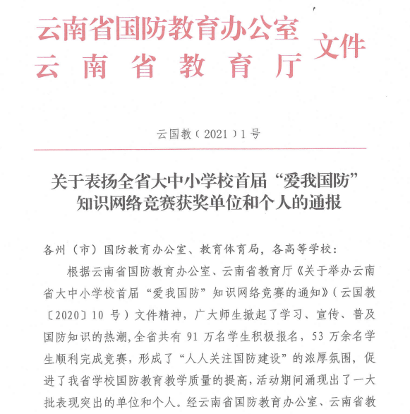 近日,云南省国防教育办公室、云南省教育厅下发了《关于表扬全省大中小学校首届“爱我国防”知识网络竞赛获奖单位和个人的通报》,我校荣获组织奖,我校教师张德军、周朝章、张永明荣获指导教师奖,我校学生戚正鹏、尹隆胜等7位同学共获二等奖2名,三等奖5名。