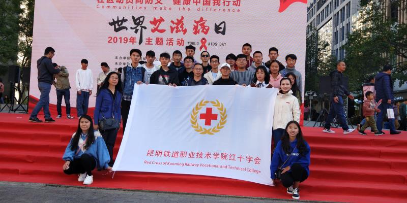 11月30日上午,昆明铁道职业技术学院红十字会全体会员在学生处处长杨华和指导老师谢永仙的带领下到南屏街步行广场参加了云南省防治艾滋病工作委员会主办、昆明市防治艾滋病工作委员会承办、昆明市疾病预防控制中心、昆明日报协办的“2019年‘12·1’年世界艾滋病日主题宣传活动”。今年活动的主题是“社区动员同防艾 健康中国我行动”,旨在强调包括参与防治艾滋病工作的社会组织、基层医疗机构、(村)居民委员会等社区的优势和作用,强调个人健康责任意识,与政府、部门和其他社会力量一起,共同控制艾滋病和推进“健康中国我行动”,为遏制艾滋病流行和健康中国建设作出贡献。