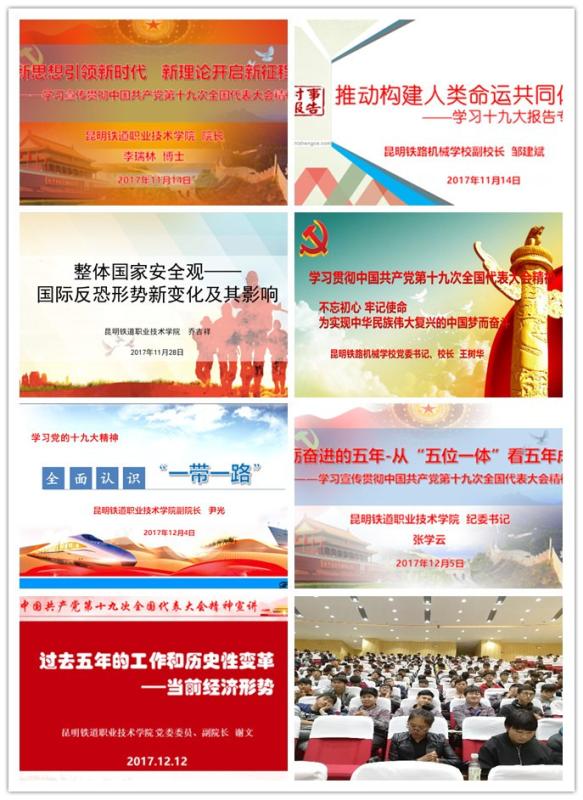 为深入学习贯彻中国共产党第十九次全国代表大会精神,贯彻落实全国高校思想政治工作会议要求,昆明铁道职业技术学院、昆明铁路机械学校领导班子全体成员带头宣讲党的十九大精神,讲授《形势与政策》课。