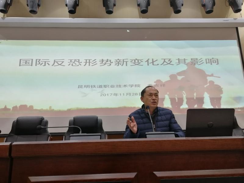 2017年11月28日,乔吉祥副院长为铁道运输系讲授《整体国家安全观—国际反恐形势新变化及其影响》
