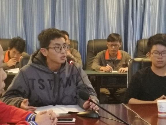 系学生会副主席马腾虎同学结合自己的实际,阐述了中国共产党领导下使家乡变得越来越好及反腐倡廉带来风清气正的社会风气,谈到参加全国铁道机车技能比赛的感受,希望大家要有时代紧迫感。