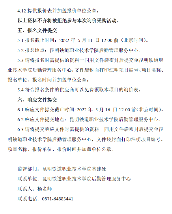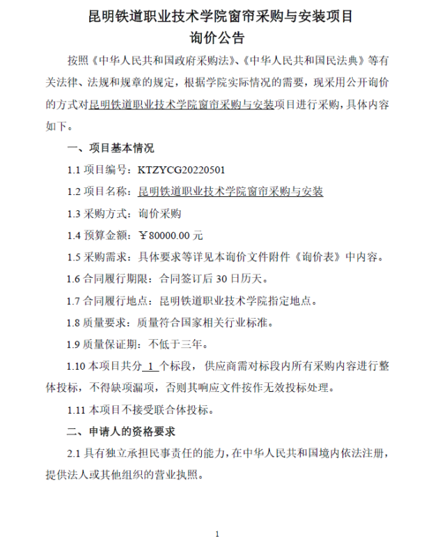 昆明铁道职业技术学院窗帘采购与安装项目询价公告(项目编号:KTZYCG20220501)