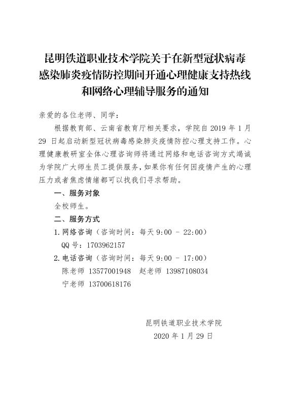 昆明铁道职业技术学院关于提供新型冠状病毒疫情防控心理支持的通知