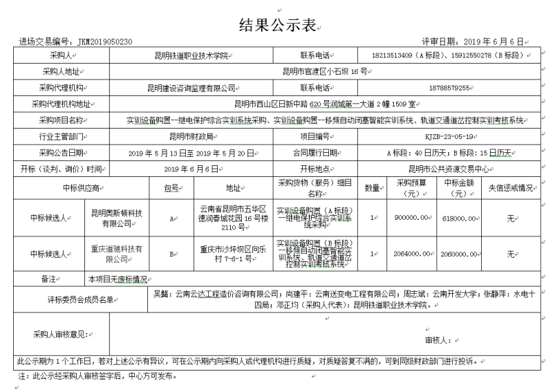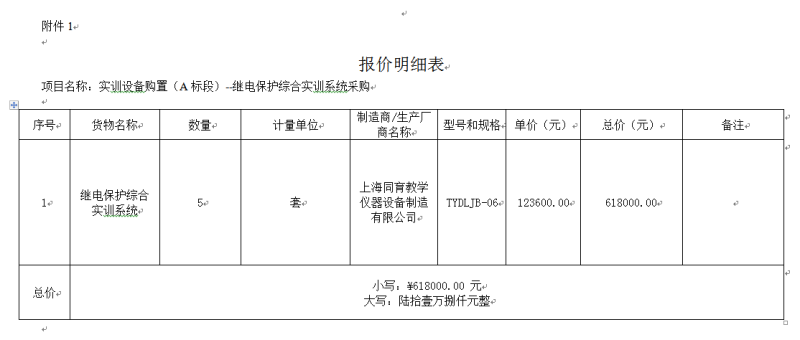 评标结果公示表(实训设备A、B标段)